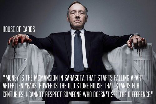 The quest for power is so apparent in House of Cards that in the most recent season, Frank Underwood, the protagonist played by Kevin Spacey, tells his wife (Robin Wright), who no longer shares a bed with him, ‘they don’t understand us’. The point being that although they no longer passionately love each other, they remain partners because together they can reach their career goals (to be president and Vice President) better than if they were separated; such is the motivation. Ultimately, their shared love of and love for power, is more than enough to keep them together.